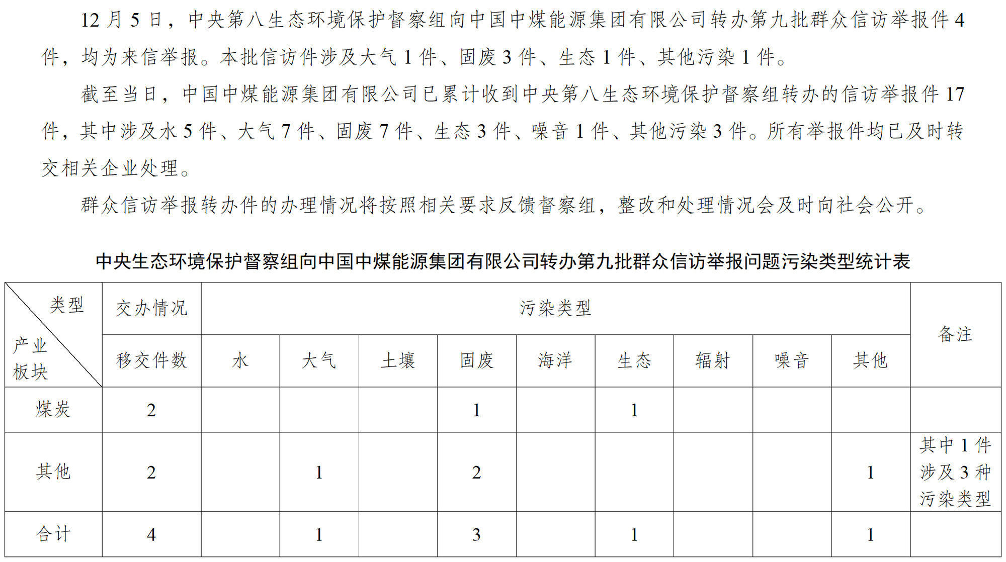 中央第八生態環境保護督察組向中國中煤能源集團有限公司轉辦第九批群眾信訪舉報件